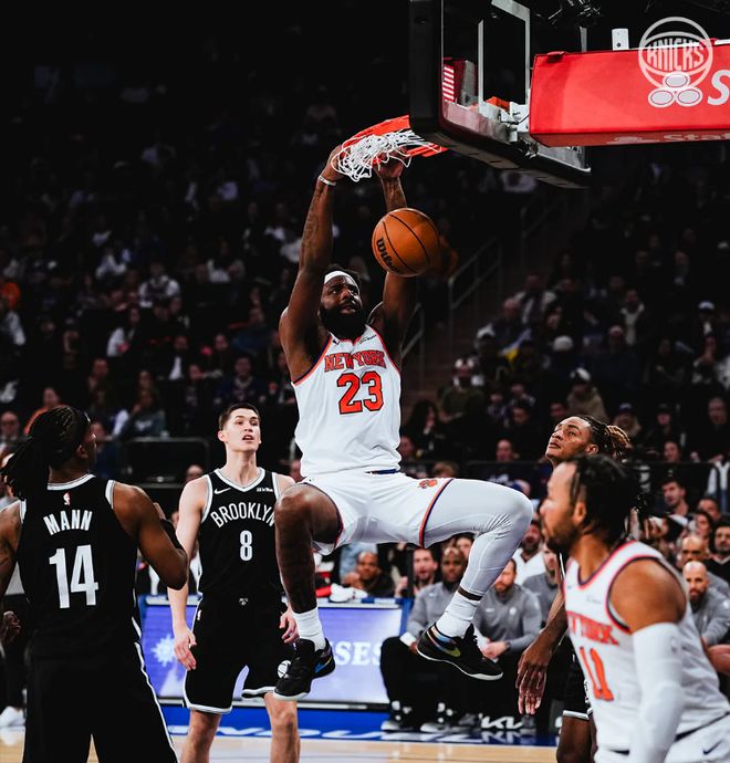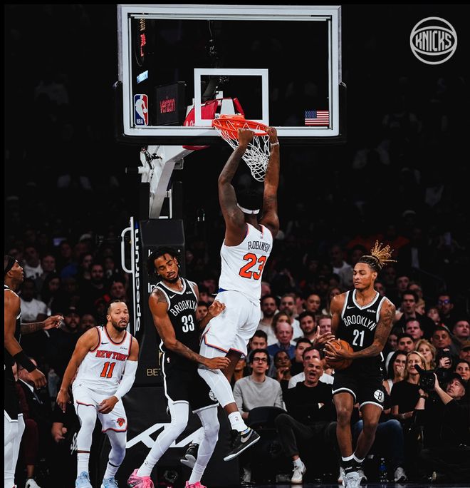 在最近的一场比赛中,尼克斯队以134-98血虐了篮网队36分,在这一场比赛中,尼克斯队首节便以18分的净胜分(40-22)奠定了胜局,首发五虎中的布伦森+汤神+布里奇斯+阿努诺比都在半场时间里,高效砍下了15+的得分,不过,最令人钦佩的应该是首发五号位的米切尔-罗宾逊。
